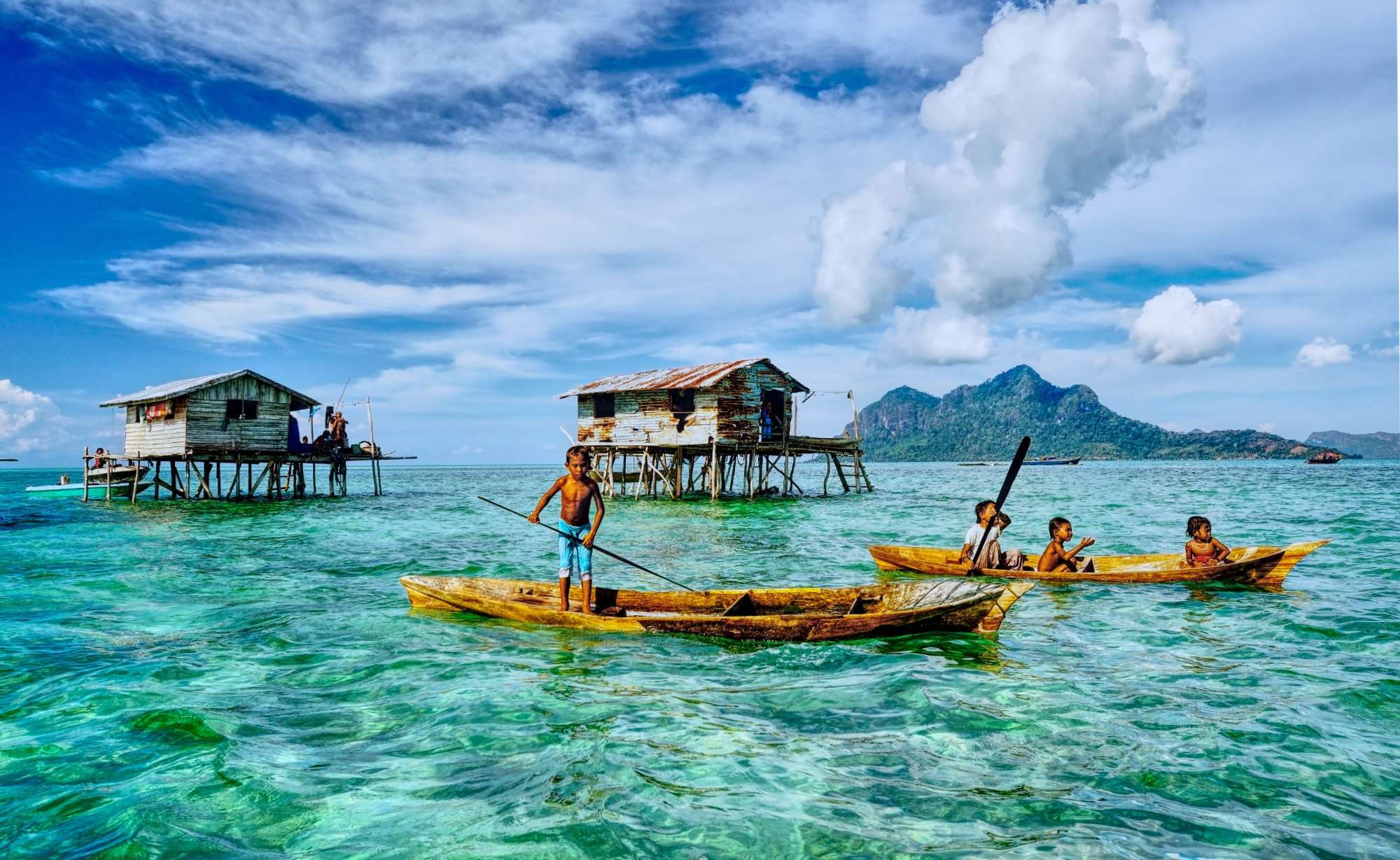 On the island of Bungin we explored a village of the Bajau people, sea gipsies who build their houses on stilts, escorted by the local band and two dozen children.