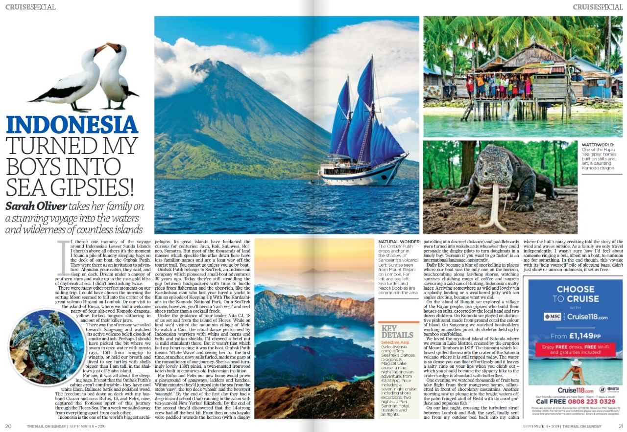 It’s not that the Ombak Putih’s cabins aren’t comfortable – they have cool white linen, Balinese batik and polished wood. The freedom to bed down on deck with my husband Ciaran and sons Rufus, 13, and Felix, nine, captured the footloose spirit of this journey through the Flores Sea. For a week we sailed away from everything apart from each other.