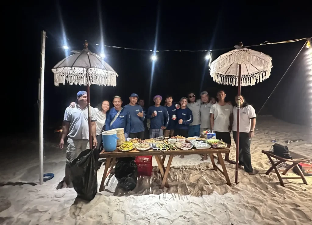 While in the water, the atoll’s beach was raked clean of coral rubble, a BBQ pit dug, lights set up, and a boom box fired up. With the whole crew, we ate sang and danced for several hours to end our adventure.