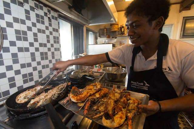 While SeaTrek’s bugis pisini designs pay homage to centuries past, both ships have luxury accommodations and first-in-class safety and navigation equipment. As with all boats, cabin space is tight, but I was pleasantly surprised to find plenty of space for my clothing and toiletries, plus the extra camera gear I’d brought along.