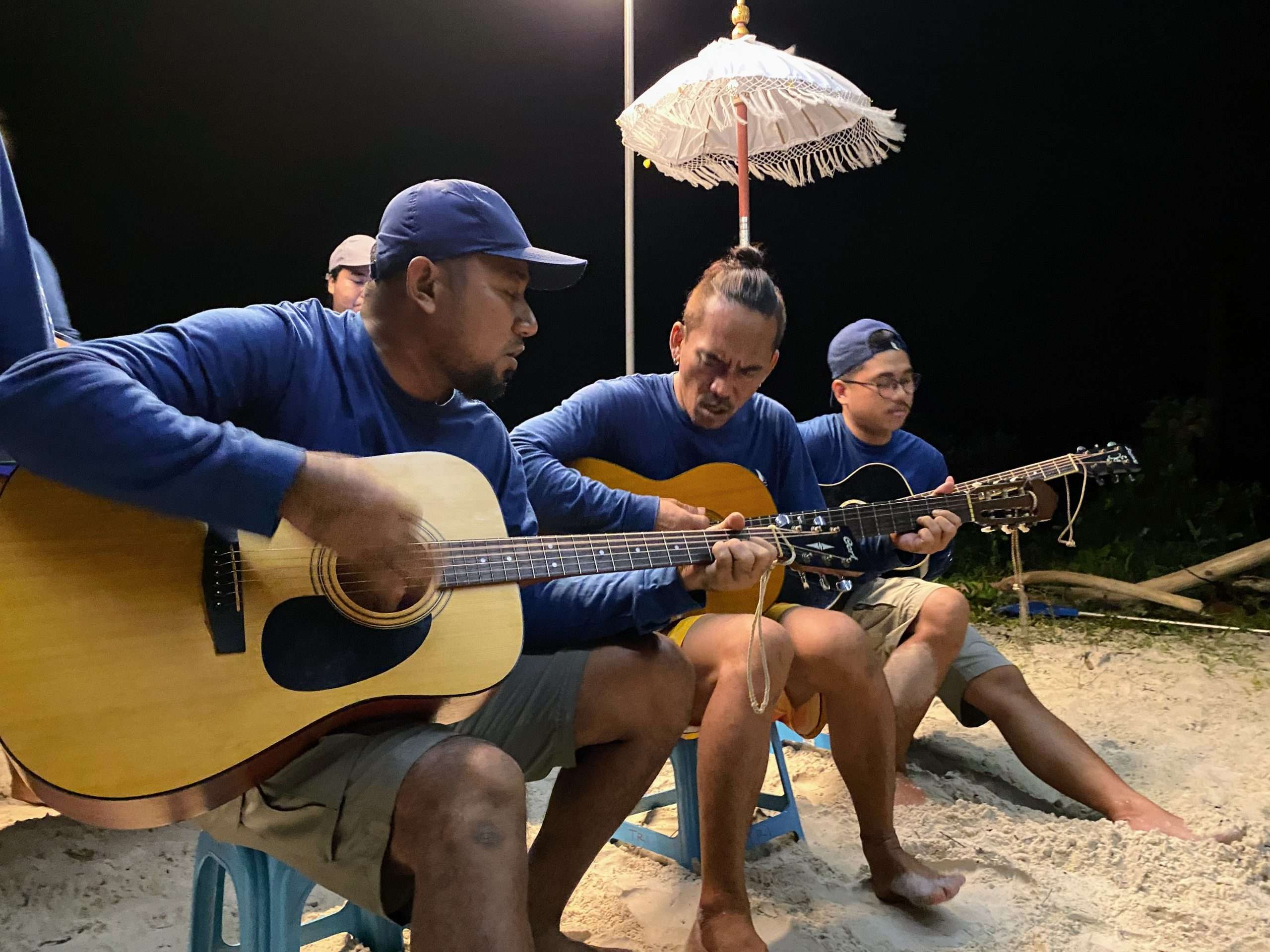 On the last night of the cruise, crew and guests celebrated with a farewell beach party, complete with coolers of Bintang beers, Christmas lights on palm trees, and enough barbecued lobster, whole fish, and shrimp to supply Bubba Gumps’ franchises for an entire year. The guitars, tambourines, and ukuleles came out after supper, and crew and passengers alike launched into Bintang-fueled jam sessions of Bob Marley and John Denver ballads remixed with Indonesian pop standards. Arie sang so soulfully that I encouraged him to forsake his life at sea and take a shot at The Voice Indonesia.