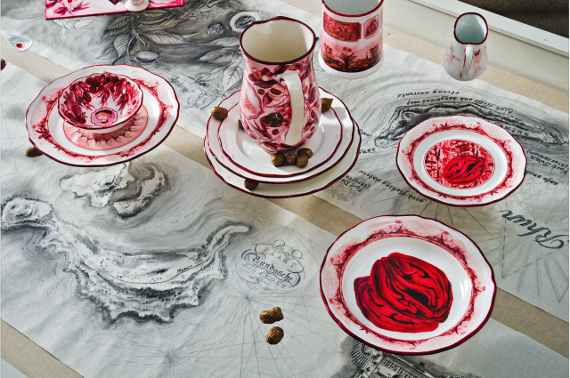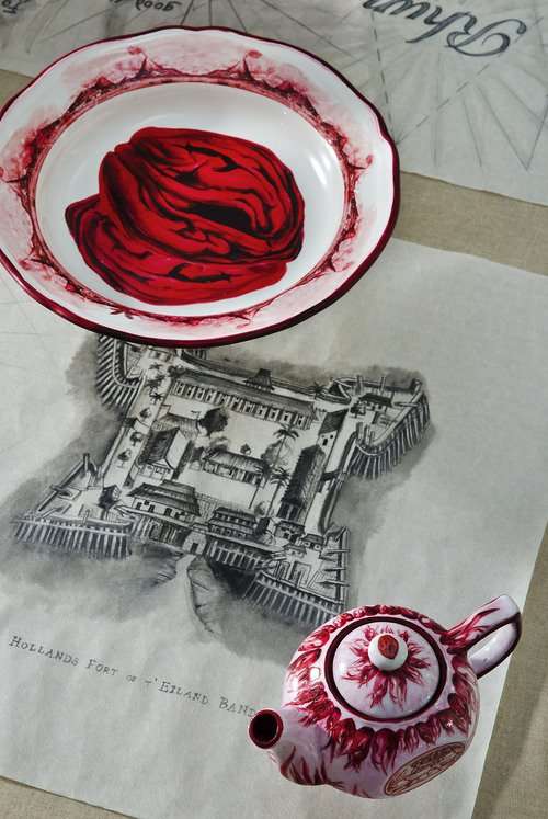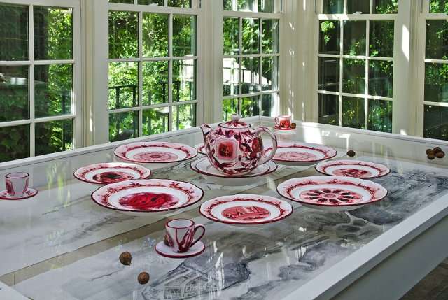 In September 2015 the conceptual artist Beatrice Glow created what she described as the Rhunhattan Tearoom in the Sunroom Project Space, of the Wave Hill Public Garden and Cultural Center, Bronx, New York. The exhibition consisted of acrylic and decal collage on ceramics, ink on paper and terracotta infused with the scents of colonial commerce such as cloves and nutmeg.