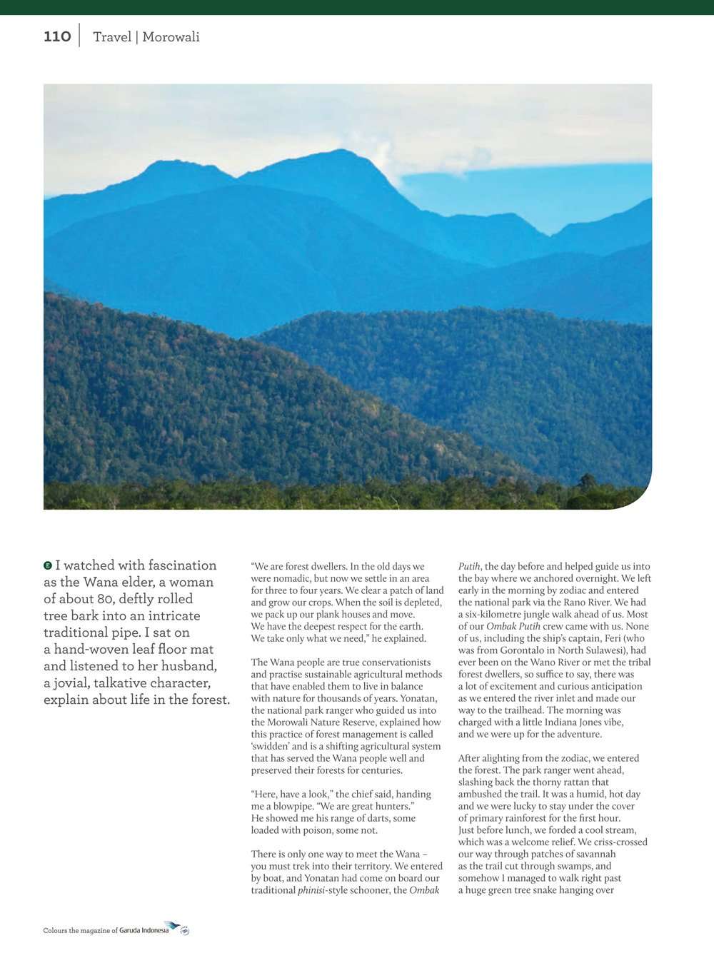 There is only one way to meet the Wana- you must trek into their territory. We entered by boat, and Yonatan had come on board our traditional phinisi-style schooner, the Ombak Putih, the day before and helped guide us into the bay where we anchored overnight. We left early in the morning by zodiac and entered the national park via the Rano River. We had a six-kilometre jungle walk ahead of us. Most of our Ombak Putih crew came with us. None of us, including the ship’s captain, Feri (who was from Gorontalo in North Sulawesi), had ever been on the Wano River or met the tribal forest dwellers, so suffice to say, there was a lot of excitement and curious anticipation as we entered the river inlet and made our way to the trailhead. The morning was charged with a little Indiana Jones vibe, and we were up for the adventure.