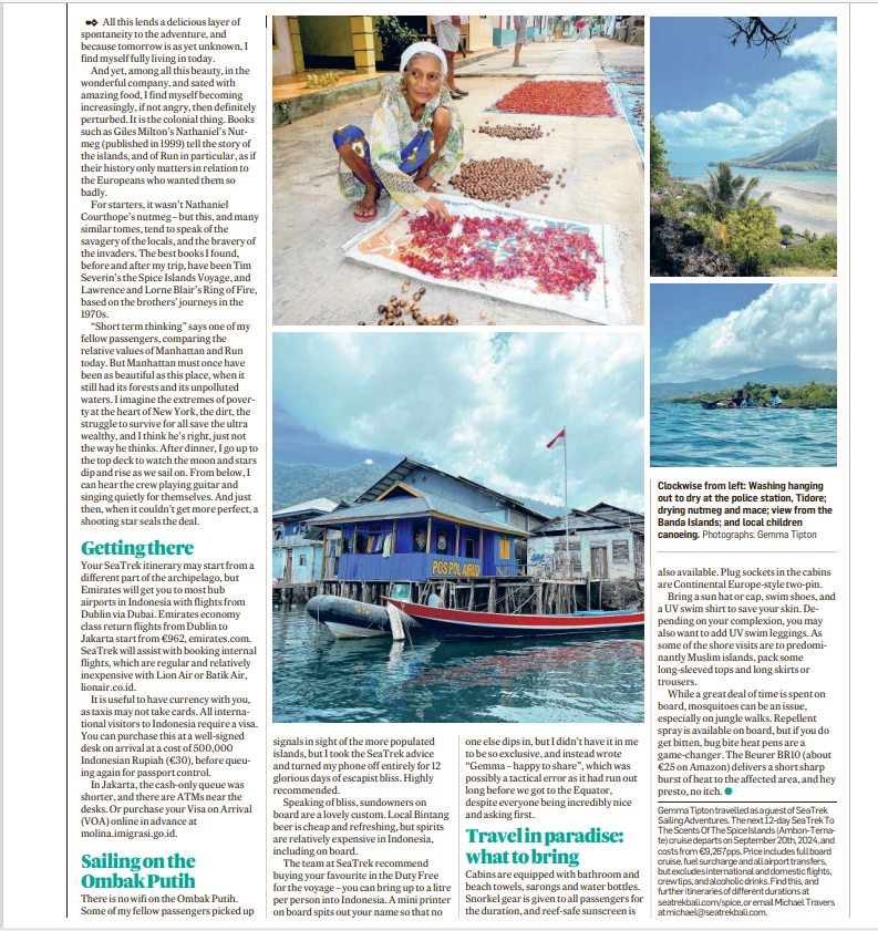 Gemma Tipton travelled as a guest of SeaTrek Sailing Adventures. The next 12-day SeaTrek To The Scents Of The Spice Islands (Ambon-Ternate) cruise departs on September 20th, 2024, and costs from €9,267 pps. Price includes fullboard cruise, fuel surcharge and all airport transfers, but excludes international and domestic flights, crew tips, and alcoholic drinks. Find this, and further itineraries of different durations at seatrekbali.com/spice, or email Michael Travers at michael@seatrekbali.com.
