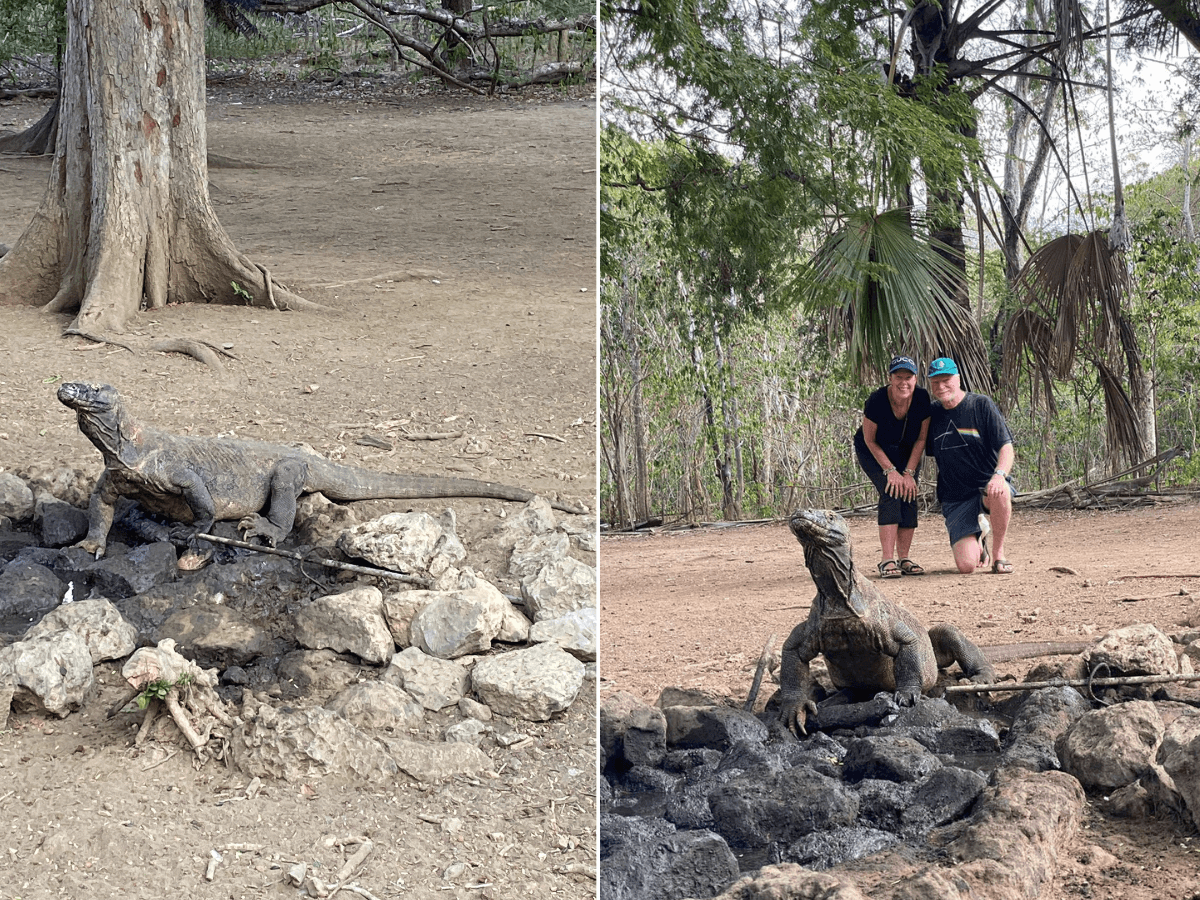 After an early breakfast we went ashore to Komodo Island at 7am. We picked up one guide for the front and one for the back of the group and pretty much straight away we spotted a juvenile Komodo just wandering along beside the track. We chose the medium length track and it was an easy stroll. We spotted a huge one that was drinking from a small pipe they installed underground from over a km away at the village to supply water for the dragons. We all posed with him from a safe distance and our ever-attentive guides took fantastic photos of all of us.