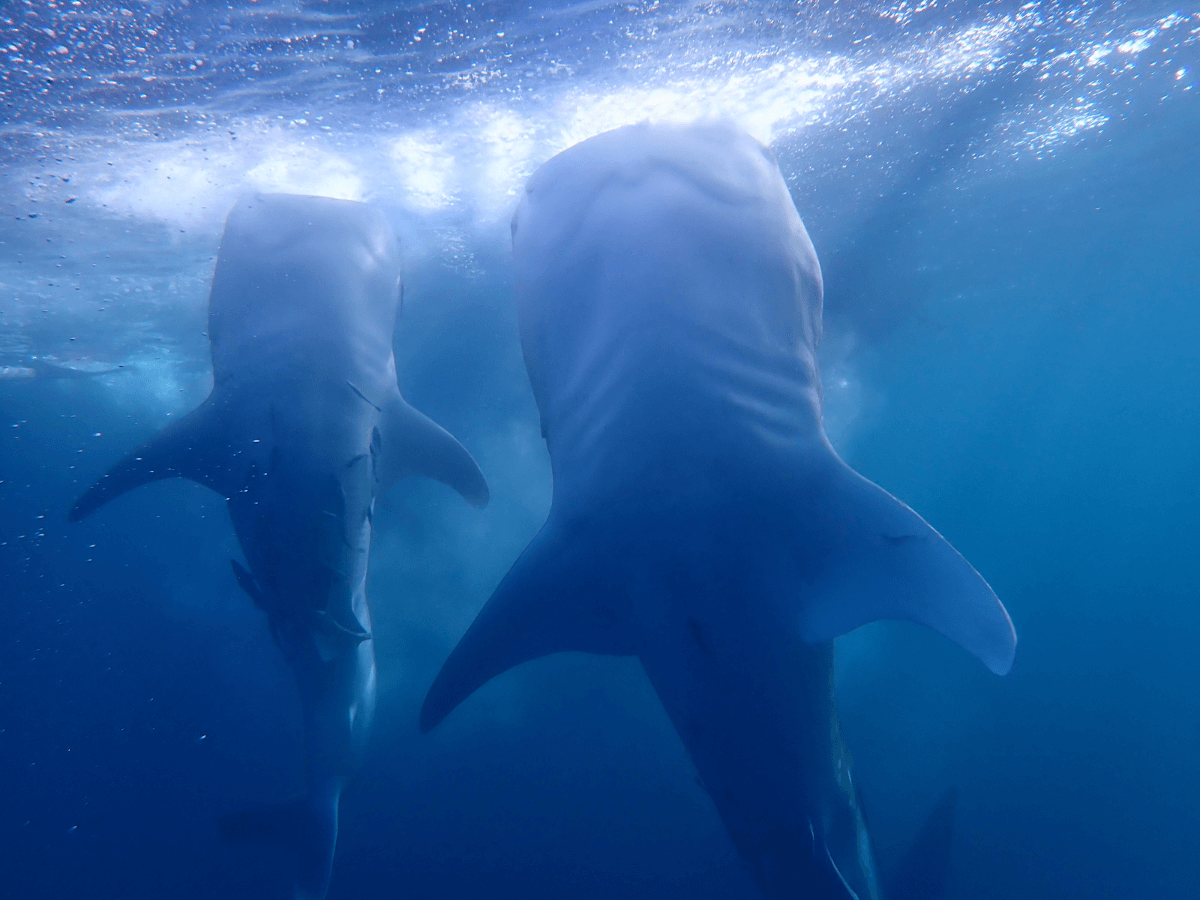 I put my head under and was instantly in awe as right nearby there was one massive 9 metre shark completely vertical with his mouth up to the surface drinking the water. At first, I was pretty scared as I didn’t initially trust them not to touch me or whack me with their tail as we were so close by. I freaked out at first as the big one dropped into a horizontal position and was swimming straight towards us with his mouth open, something we were told to avoid. He was literally inches from me, and I held onto my friend Fabi and my husband, Bruce, beyond her trying to move myself away from the shark with a lot of swearing! Heck! You soon learn they have amazing spatial awareness, and I began to trust them.