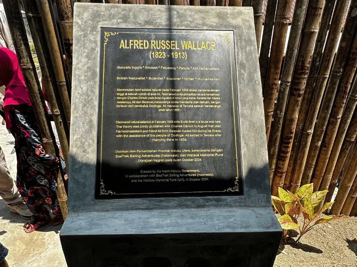 The modest Dodinga house where Wallace survived the malaria attack and penned his notes on evolution is long gone, but its site is the last in a row of about eight modest shacks down a side street opposite one of the village’s mosques. Three days after our visit, the village of Dodinga hosted a visit by the Governor of Maluku, the British Ambassador to Indonesia, Alfred Wallace’s Great Grandson William Wallace, and Dr Beccaloni. A plaque at the side street’s intersection with the track we walked from the wharf to the village was unveiled, recording the importance of the Dodinga events.