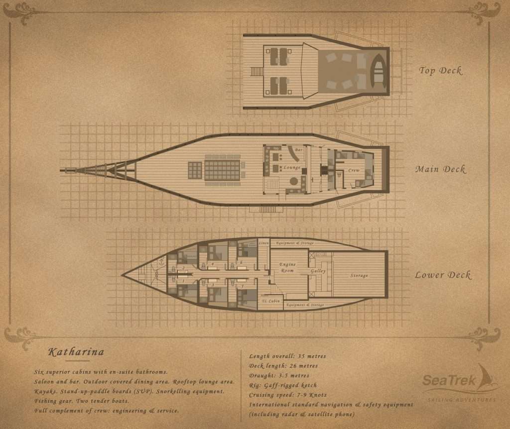 Led by Captain Jeffri and operated by a crew of 12, the 38-metre Katharina sits low in the water, making her a most beautiful looking boat.