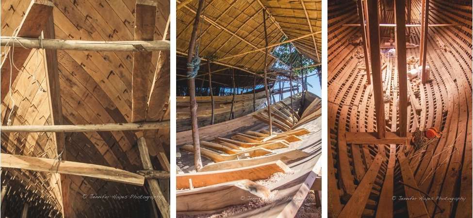 Without any sketches or calculations, today’s pinisi are built traditionally still using many customary hand tools equipment – although electric drills and chainsaws have somewhat sped up the process. The keel is laid first, then the stem and stern post are erected. However, unlike Western wooden ships where the shape of the hull is built up by attaching wooden planks to a frame or mould, when building a pinisi the planking is assembled before the frame! From the keel upward, the planks are fitted to each other and fastened wooden dowels hammered into hand-drilled holes in the planks’ edges. Plank by plank from the keel to the deck, until the form of the hull emerges. Amazingly, this is all done by eye, without the use of plans or moulds but according to the experience of each master builder.