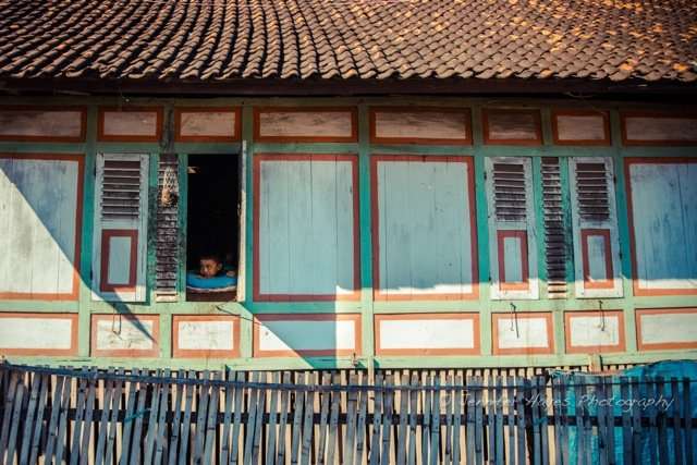 Most homes in Sumbawa are built up off the ground. Building one’s house on stilts serves a variety of functions: natural air conditioning, flood protection, pest control and storage for materials or livestock. In Sumbawa, homes of common people are called bale and homes of the upper class are called bala. Here,a boy meant to be taking his afternoon nap is sneaking a peak of the neighbourhood activities.
